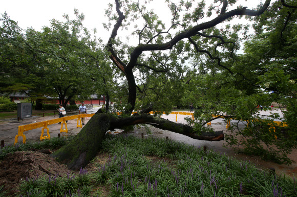 24일 서울 종로구 창덕궁 금호문 인근에 있는 회화나무 한 그루가 장맛비와 바람에 쓰러져 있다. 이 나무는 천연기념물 472호로 지정된 8그루의 창덕궁 회화나무 가운데 한 그루로 높이 10m, 가슴높이 줄기 지름은 90㎝다.