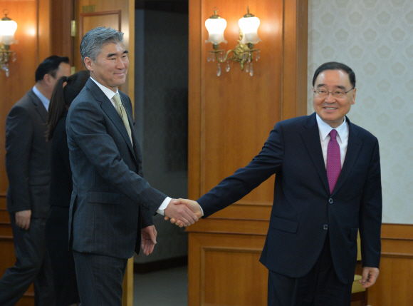 정홍원(오른쪽) 국무총리가 21일 서울 종로구 세종로 정부서울청사에서 3년 임기를 마치고 오는 24일 한국을 떠나는 성김 주한 미국대사의 이임 인사를 받으면서 아쉬운 듯 악수를 나누며 움켜쥔 오른손을 놓지 않고 있다.