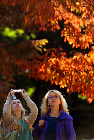 단풍 고운 빛 담아갈래요  28일 서울 창덕궁을 찾은 외국인 관광객들이 아름답게 물들고 있는 단풍을 즐기며 카메라에 담고 있다.<br>박윤슬 기자 seul@seoul.co.kr