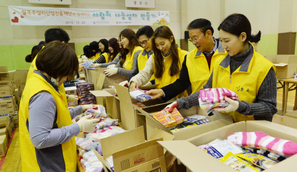 22일 서울 종로구청에서 열린 ‘사랑의 나눔상자 만들기’ 행사에서 월곡주얼리산업진흥재단 직원들과 학생들이 불우이웃에게 전달할 생필품들을 상자 안에 담고 있다.