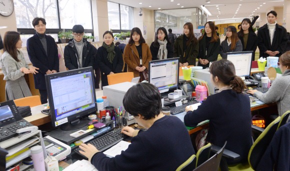 서울 종로구청에서 5일 대학생 행정체험단이 민원실 담당자들로부터 오리엔테이션을 받고 있다. 종로구는 겨울방학 기간인 1월 한 달간 체험단 25명을 선발해 행정보조 업무를 경험토록 하고 있다.
