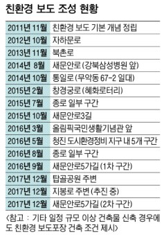친환경 보도는 김 구청장이 2010년 민선 5기 취임 후 1년 뒤 개념을 정립한 뒤 2012년부터 본격적으로 시공했다. 12월 현재 자하문로를 시작으로 북촌로, 새문안로, 창경궁로, 종로 등 공공 지역 10곳 이상에서 103억원의 예산을 들여 연장 4580m의 친환경 보도를 조성했다. 경희궁 자이 앞 등 대단지 인근에도 친환경 보도를 포장한 곳이 있다. 1㎡당 공사비 기준 일반블록은 4만 4900원, 친환경 보도블록은 19만 7000원으로 가격 차이가 4배가량 나지만 친환경 보도블록은 수명이 일반블록의 10배인 100년 이상이어서 경제적이라는 계산이 나온다.