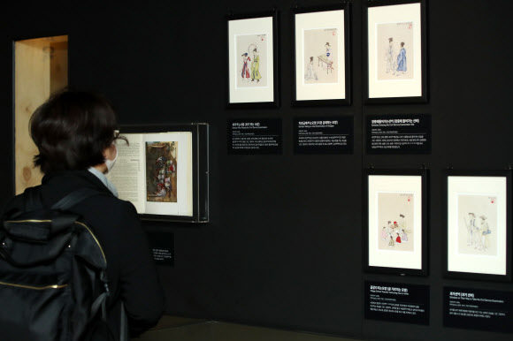 126년 만에 고국에 온 ‘기산 풍속화’  19일 서울 종로구 국립민속박물관에서 열린 특별전 ‘기산 풍속화에서 민속을 찾다’ 언론 공개회에서 한 관계자가 그림을 살펴보고 있다. 이번 전시에서는 19세기 말에 활동한 풍속화가 기산 김준근의 그림과 두부판, 씨아 등 민속자료 등 340여점을 소개한다. 특히 독일 로텐바움세계문화예술박물관(MARKK) 측이 소장하고 있던 기산 풍속화 79점이 한국을 떠난 지 126년 만에 돌아와 한국 관람객을 만난다.<br>연합뉴스