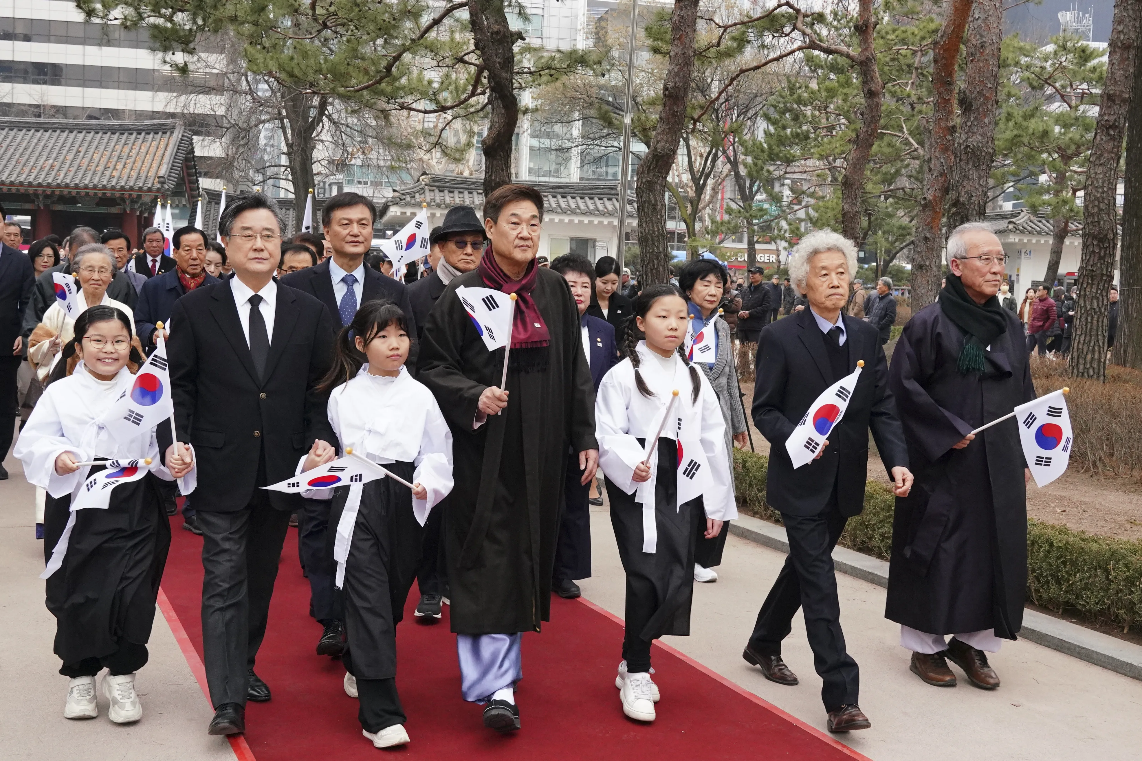 태극기 행진은 1919년 3월 1일 역사적 순간을 재현했다. 제56보병사단 기수단은 앞에서 1942년 이승만 대통령이 뉴욕에서 한국독립 만찬회를 열 때 사용한 ‘뉴욕 월도프 아스토리아 호텔 게양 태극기’의 대형 복제본을 들고 행진했다. 참여자들 또한 기수단을 따라 손 태극기를 흔들며 삼일문에서 팔각정까지 함께 행진했다. 타종 퍼포먼스는 독립을 위해 헌신한 조상들을 추모하고 후손으로서 나라를 더욱 발전시키겠다는 의지를 표명했다. 이어 독립운동가 정재용 선생의 후손인 정성화씨와 종로구 홍보대사 배우 공형진이 독립선언서를 낭독했다.