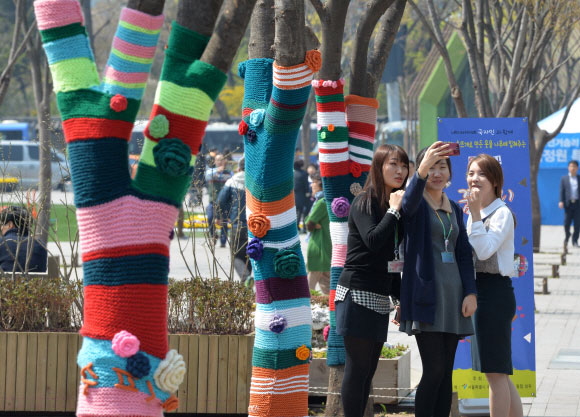 7일 서울 중구 태평로 서울광장에 설치된 희망나무 꿈 트리를 배경으로 시민들이 ‘셀카’를 찍고 있다. 시민 100명이 자발적으로 참여해 뜨개질한 옷을 입혀 트리를 만들었다.