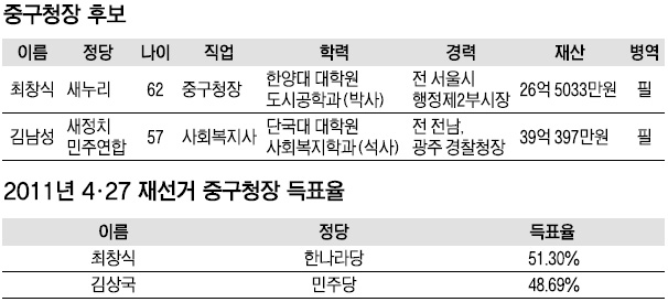 서울 중구 기초단체장 선거는 최창식 새누리당 후보와 전남·광주경찰청장(치안감)을 지낸 김남성 새정치민주연합 후보의 대결로 좁혀졌다.