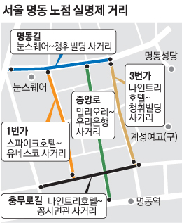 서울 중구는 명동에 난립한 노점의 기업화를 막기 위해 명동 5곳에서 노점실명제를 도입한다고 20일 밝혔다. 노점실명제는 노점 상인들에게 도로 점용을 허가해 안정적으로 운영할 수 있게끔 하는 대신 위탁 운영, 임대, 매매를 금지해 주변 상권과의 상생을 꾀하는 제도다.