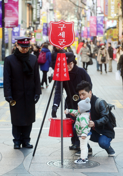 한국구세군이 모금 활동을 시작한 1일 서울 중구 명동에 설치된 자선냄비에 한 어린이가 고사리손으로 돈을 넣고 있다. 거리 모금은 이달 31일까지 한 달간 진행된다.