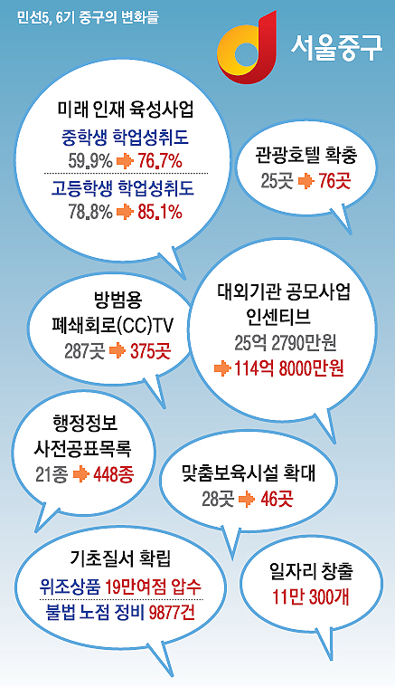 서비스 행정과 중구가 취약했던 교육 분야에도 성과가 드러나고 있다. 서울 최초로 실시한 노점상 실명제는 다른 자치구에서 잇따라 벤치마킹한다. 주민맞춤형 복지서비스인 ‘행복다온’은 전국 최초로 복지·건강·민원서비스를 주민센터로 한데 모은 통합 모델이다. “행정·복지직 공무원 구분 없이 전 직원이 취약 주민들 생계지원, 건강관리, 생활민원을 함께 챙긴다”며 “주민들이 보건소를 일부러 찾지 않아도 동주민센터에서 원스톱으로 해결할 수 있다”고 덧붙였다. 미래인재 육성 사업은 다른 지역 대비 취약한 학업 성취도를 극복하기 위한 속사정이 숨어 있다. 청구초, 대경·장원중, 장충고 등 4곳을 시범학교로 선정하고 방과후 수업, 입시상담 등을 집중 지원한 결과 중·고생의 경우 ‘보통 이상’ 성취 비율이 18.8%에서 79%로 뛰었다.