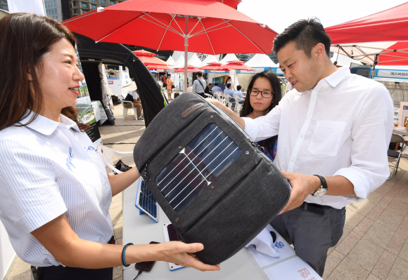 14일 서울시청 앞 서울광장에서 열린 ‘2017 서울 태양광 엑스포’를 찾은 한 시민이 가방에 달린 휴대용 태양광 발전기를 살펴보고 있다. 올해로 3회째를 맞이한 태양광 엑스포는 61개 업체가 참여했다.
