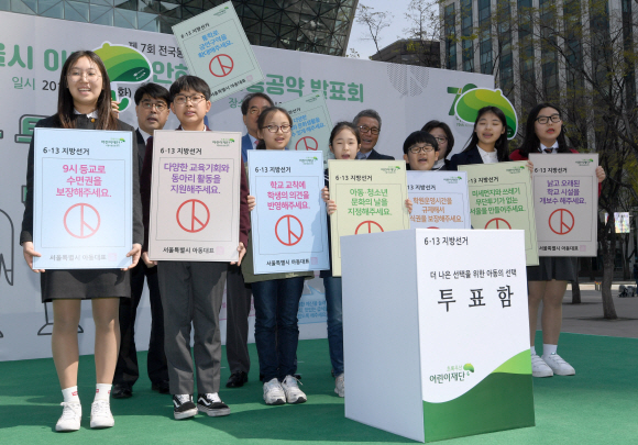 초록우산어린이재단은 10일 서울 중구 시청광장에서 어린이 대표 7인과 함께 서울시 아동이 제안하는 ‘6·13 전국동시지방선거 아동공약 발표회’를 가졌다. 이번 발표회에 참여한 아동들이 낙후된 학교교실 개·보수, 미세먼지 문제 해결 등 자신이 바라는 공약을 적은 피켓을 들고 있다. 초록우산어린이재단은 이날 서울을 포함해 전국 11개 지역에서 아동대표단과 함께 아동 공약 발표회를 열었다. 박지환 기자 popocar@seoul.co.kr