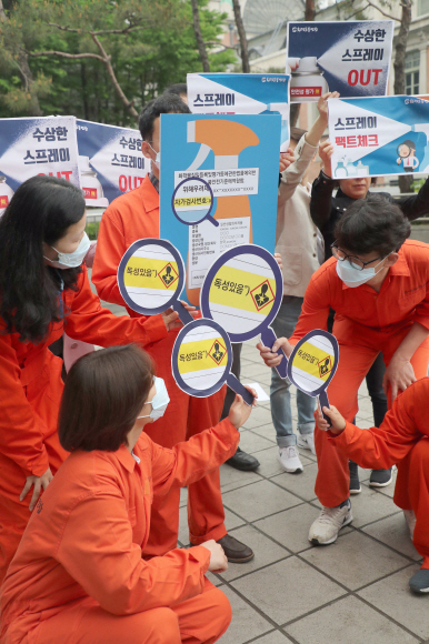 환경운동연합 소속 회원들이 2일 서울역 광장에서 스프레이형 화학제품이 안전기준 등을 잘 지키는지를 검증하는 ‘스프레이 팩트체크 전국 공동 캠페인’을 홍보하며 손팻말을 들고 있다.