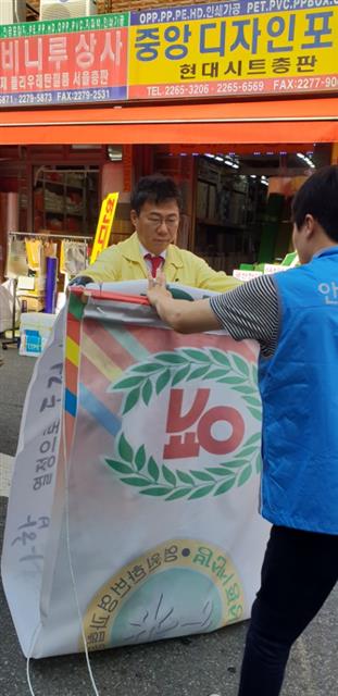 서양호(왼쪽) 중구청장이 22일 태풍 ‘솔릭’ 피해에 선제 대응하기 위해 을지로 방산시장 일대 현수막을 제거한 뒤 정리하고 있다. 서 구청장은 시장 상인들에게 수거한 현수막은 보관했다가 태풍이 지나간 뒤 돌려주겠다고 말했다. 구는 이날 지역 내 전역에서 강한 바람에 의해 입간판, 광고물, 현수막 등에 대한 날림현상으로 피해가 발생하지 않도록 사전 조치하고 대형 건축 공사장 울타리 시설, 타워크레인 등이 넘어지지 않도록 현장 점검했다. 중구 제공