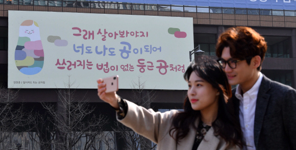 4일 서울 광화문 교보생명빌딩 광화문글판이 봄편으로 새롭게 단장된 가운데 관계자들이 셀카를 찍고 있다. 이번 문구는 정현종의 시 ‘떨어져도 튀는 공처럼’에서 발췌했다. 글판 봄편은 오는 5월까지 걸린다. 박지환 기자 popocar@seoul.co.kr