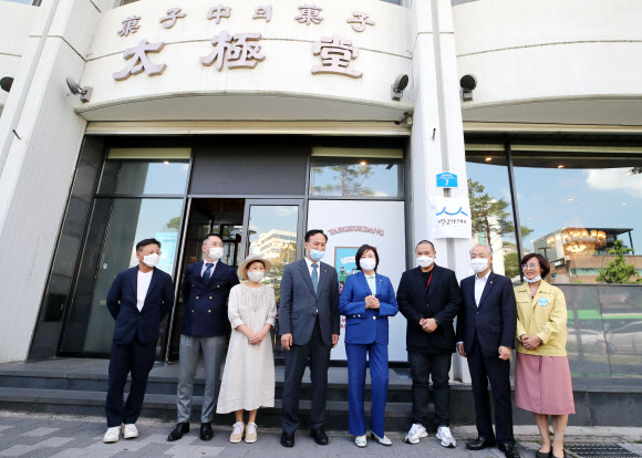 11일 오후 서울 중구 태극당에서 열린 ‘백년가게’ 현판식에서 박영선(왼쪽 다섯 번째) 중소벤처기업부 장관이 태극당 관계자들과 기념사진을 찍고 있다. 백년가게는 올해부터 국민추천제를 실시해 태극당이 국민추천 1호점으로 선정됐다. 모나카 아이스크림, 단팥빵, 전병 등을 판매하는 태극당은 1946년 창업했다.