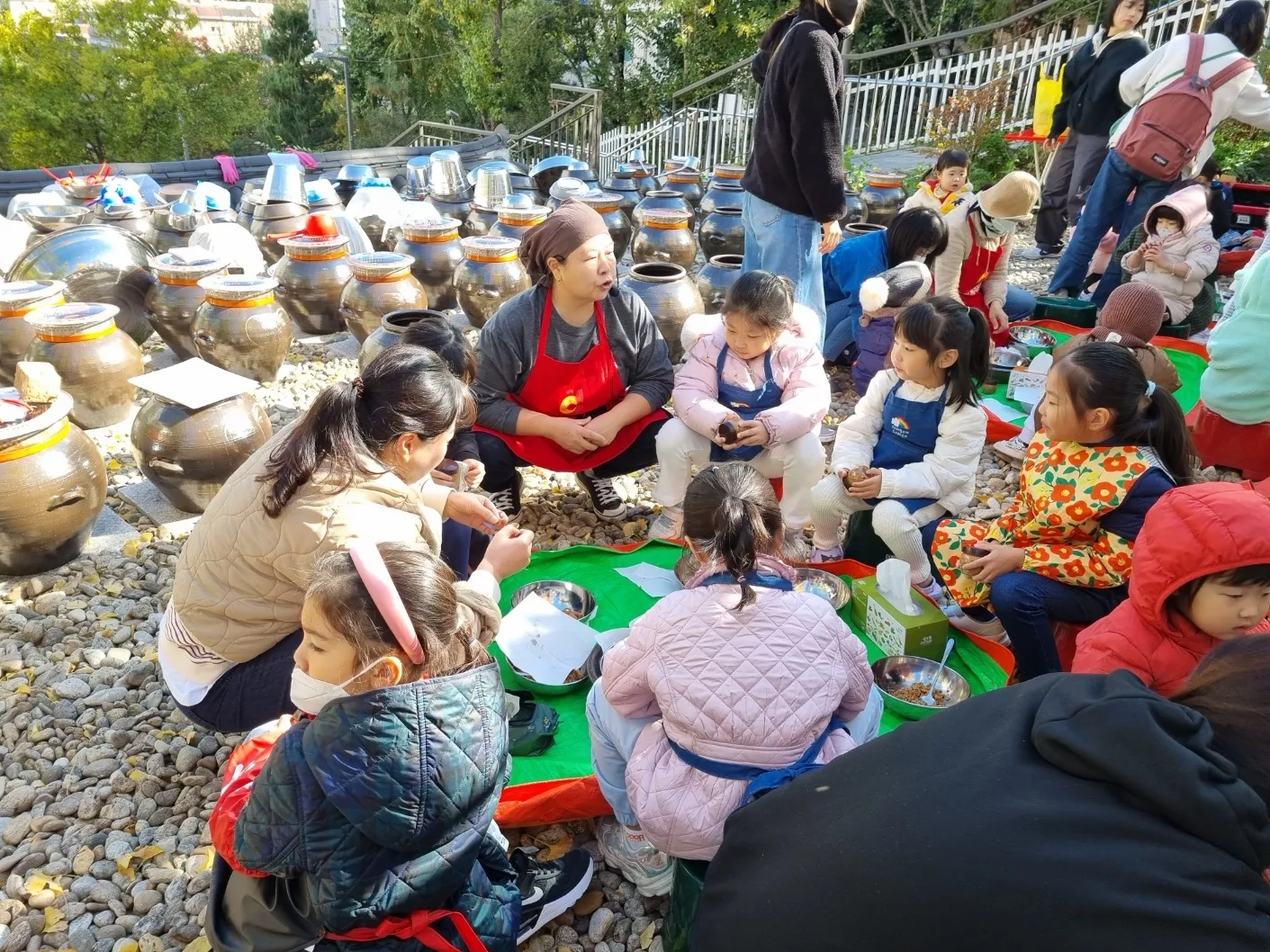지난 6일 서울 중구 동화동 주민센터 동화장독대 마당에서 열린 ‘장 나누기’ 행사에서 전문 강사가 지역 어린이들에게 간장과 된장 등에 대해 설명하고 있다.