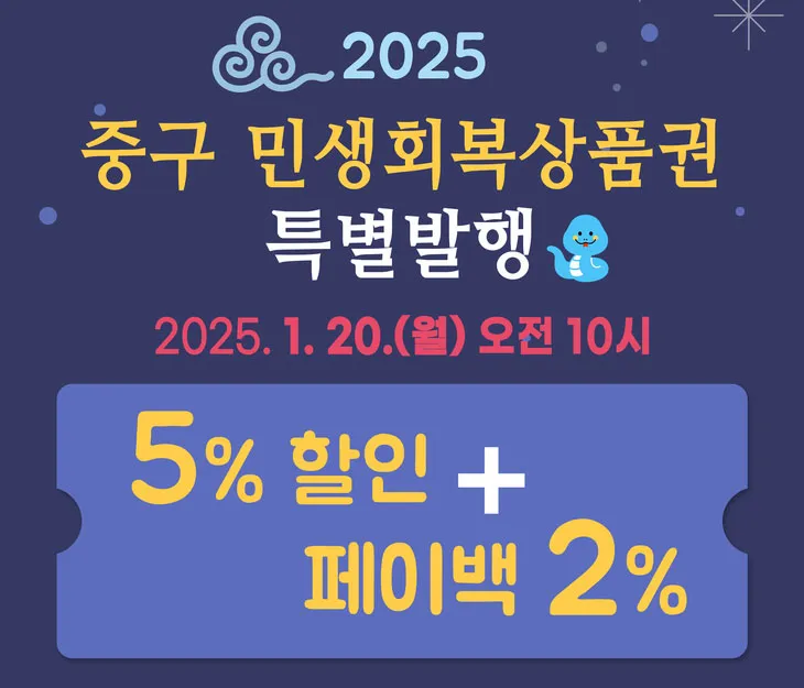 서울 중구가 설 연휴를 앞두고 40억원 규모의 ‘민생회복상품권’(포스터)을 특별 발행한다고 15일 밝혔다. 경기 침체로 주민들의 소비 심리가 크게 위축된 가운데 경제적 어려움을 겪는 소상공인을 돕기 위해서다.