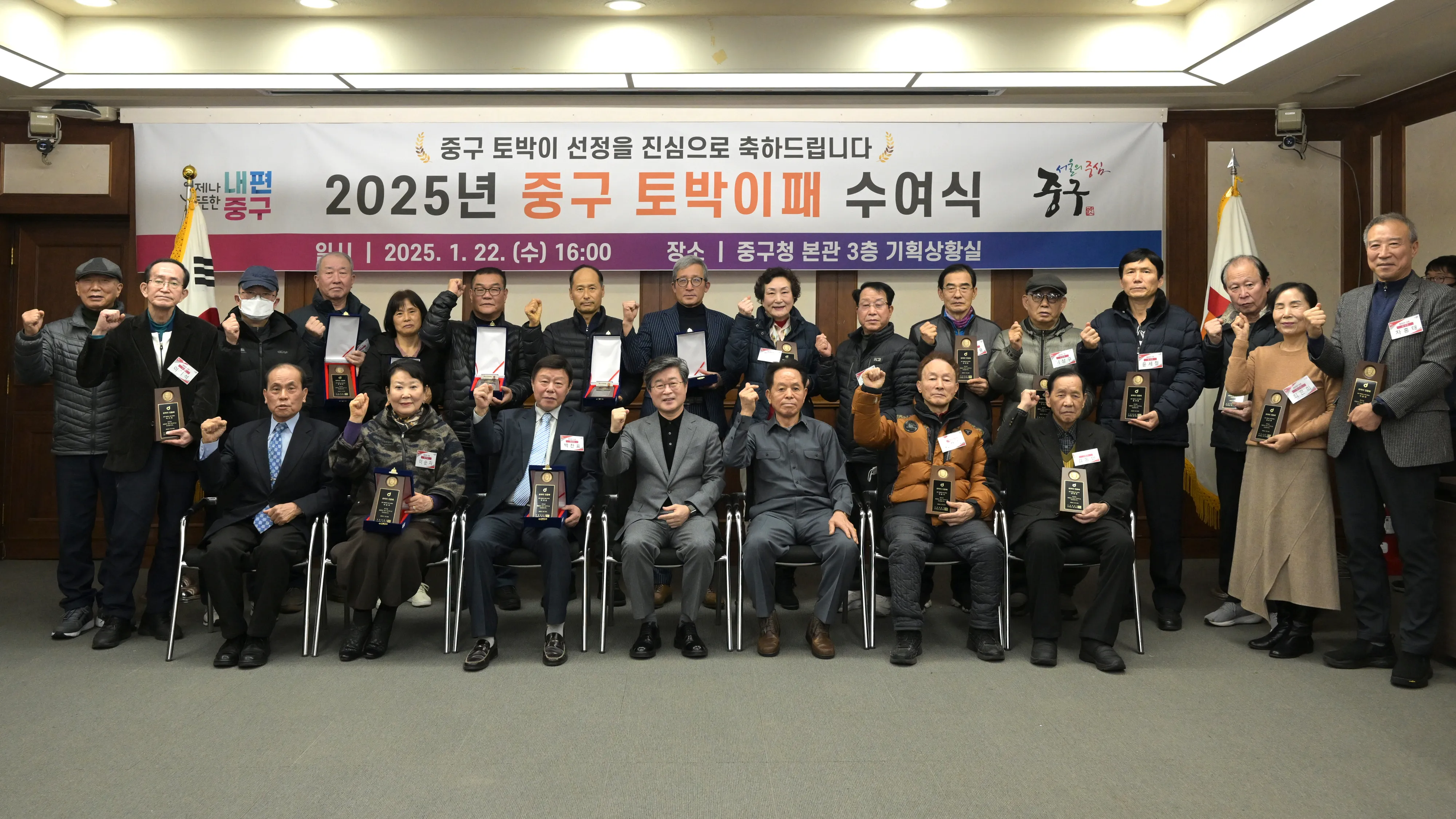 김길성(앞줄 가운데) 서울 중구청장이 지난 22일 중구청 기획상황실에서 열린 ‘2025 구 토박이 패 수여식’ 행사에서 참석자들과 기념촬영을 하고 있다.