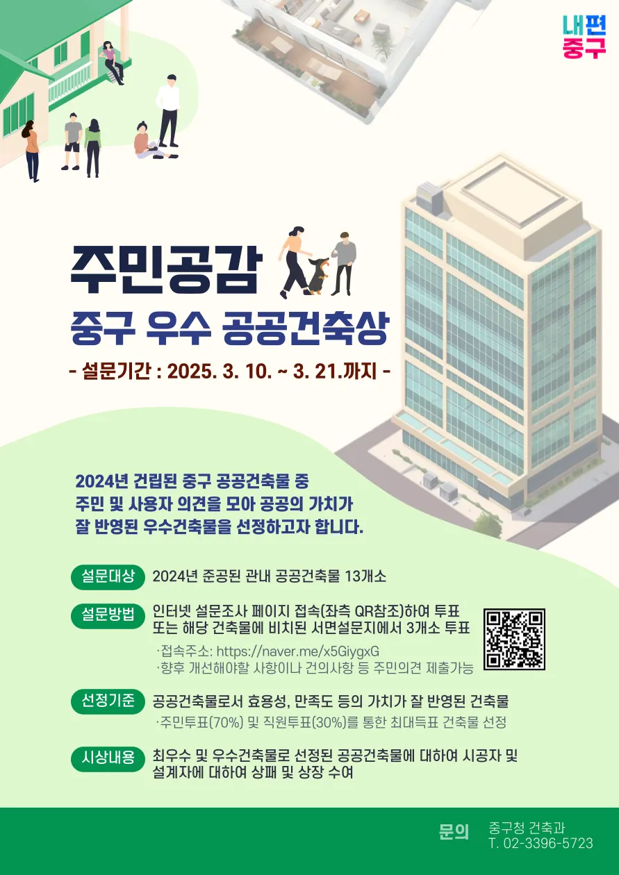 김길성 중구청장은 “공공건축물은 주민에게 소중한 공간”이라며 “이번 투표를 통해 주민의 생각을 듣고, 앞으로 구의 공공건축이 나아가야 할 방향을 찾겠다”고 말했다.