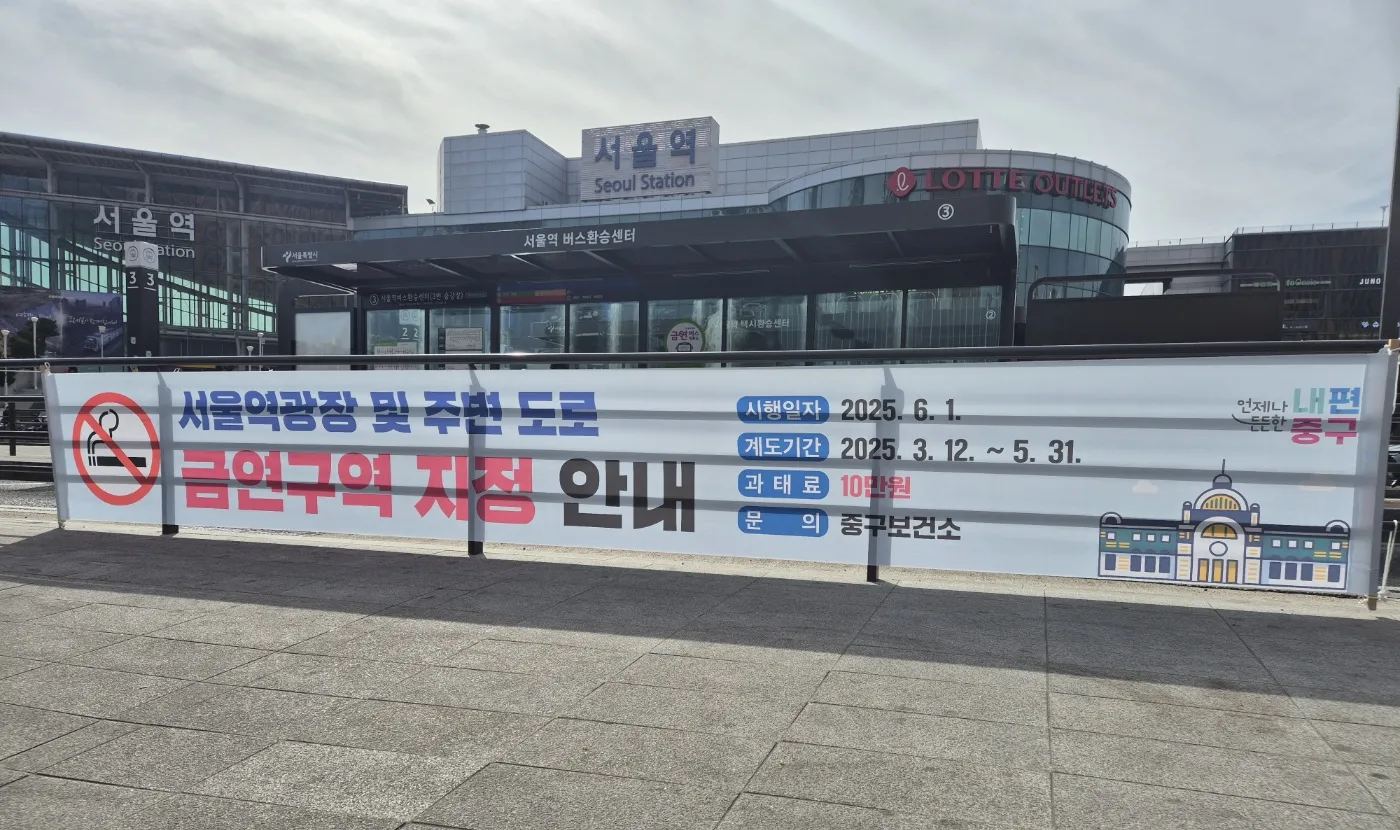 서울 중구는 오는 6월 1일부터 서울역 광장 일대와 주변 도로를 금연 구역으로 지정한다고 18일 밝혔다. 금연 구역에서 흡연하다 적발될 경우 10만원의 과태료를 부과한다.