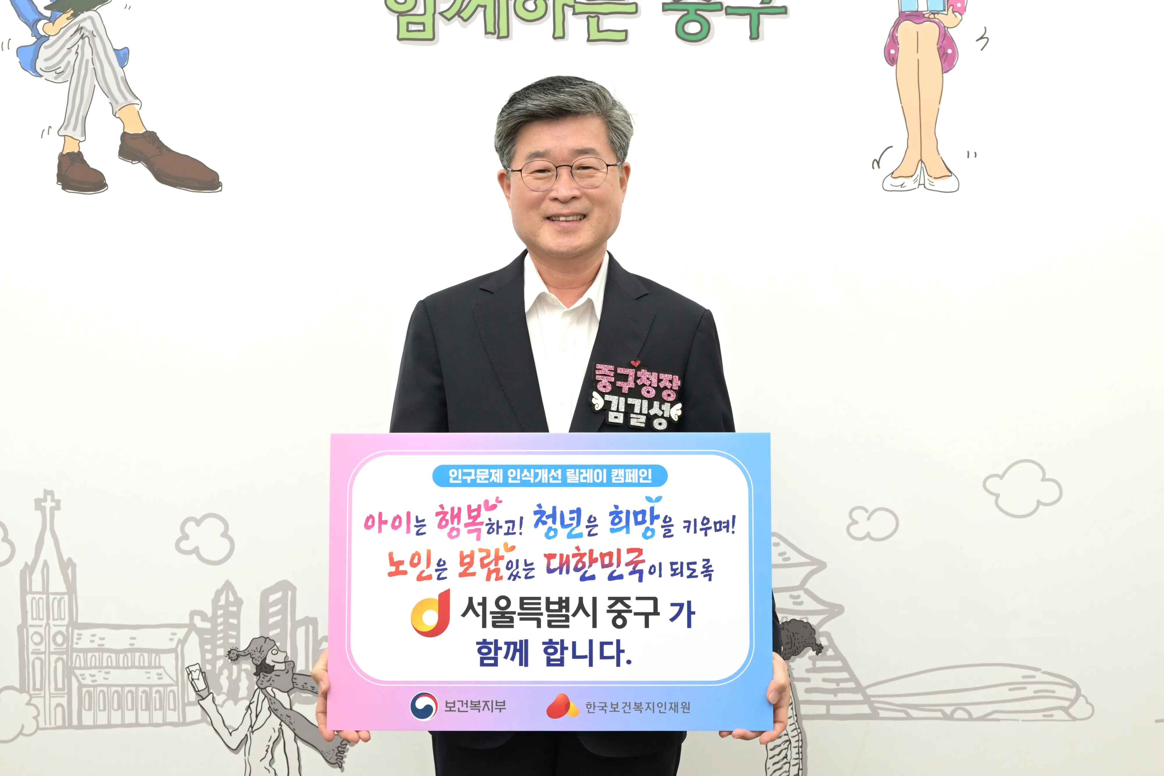 김길성 서울 중구청장이 24일 ‘인구 문제 인식 개선 릴레이 캠페인’에 참여해 저출산과 고령화 문제에 대한 사회적 인식을 높이겠다는 의지를 다졌다.