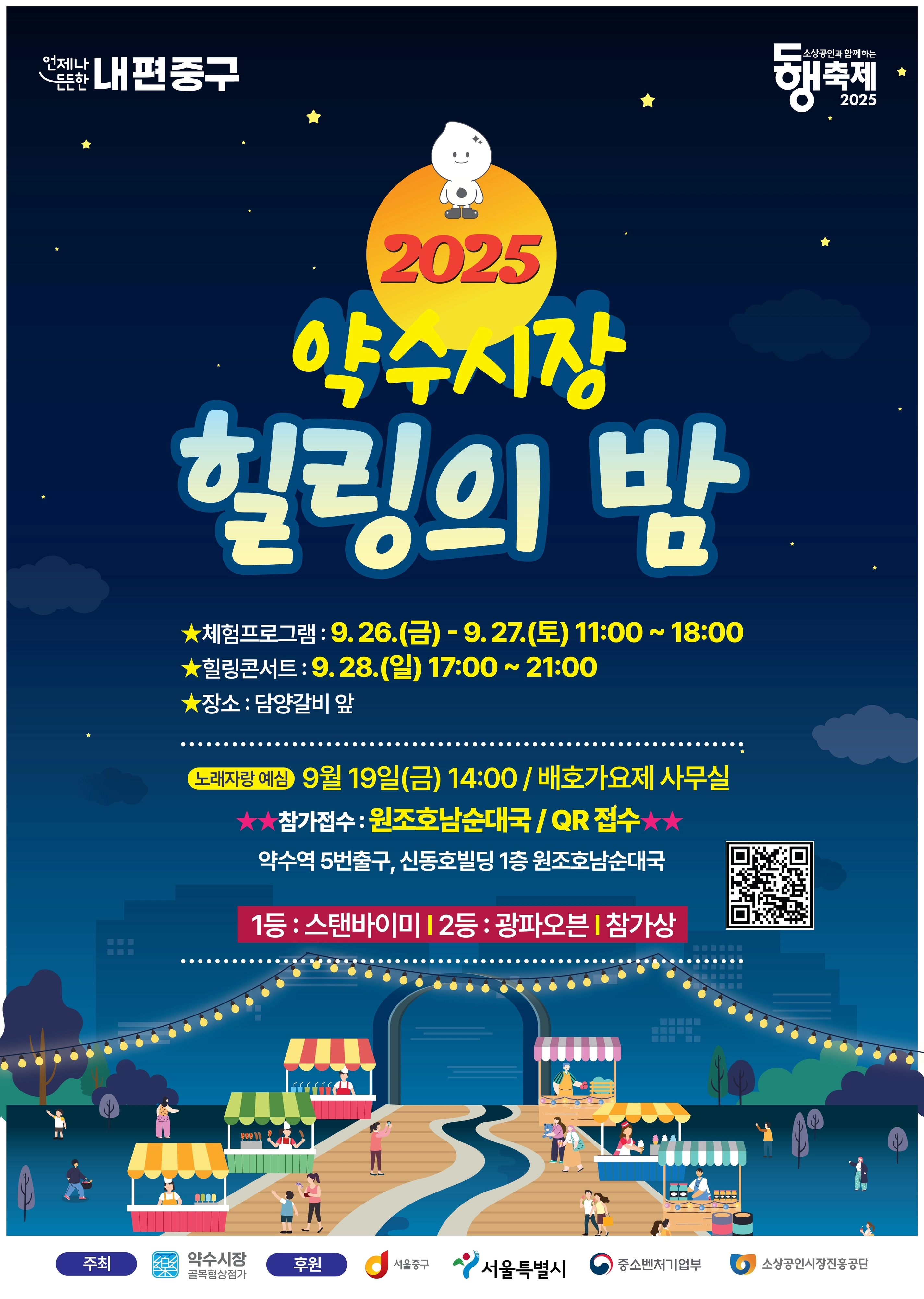김길성 중구청장은 “맛과 정이 넘쳐나는 약수시장에서 가을 정취와 함께 ‘힐링의 밤’을 만끽해 보시길 바란다”며 “이번 축제가 상권에는 활기를, 방문객에게는 즐거운 추억을 안겨주길 기대한다”고 말했다.
