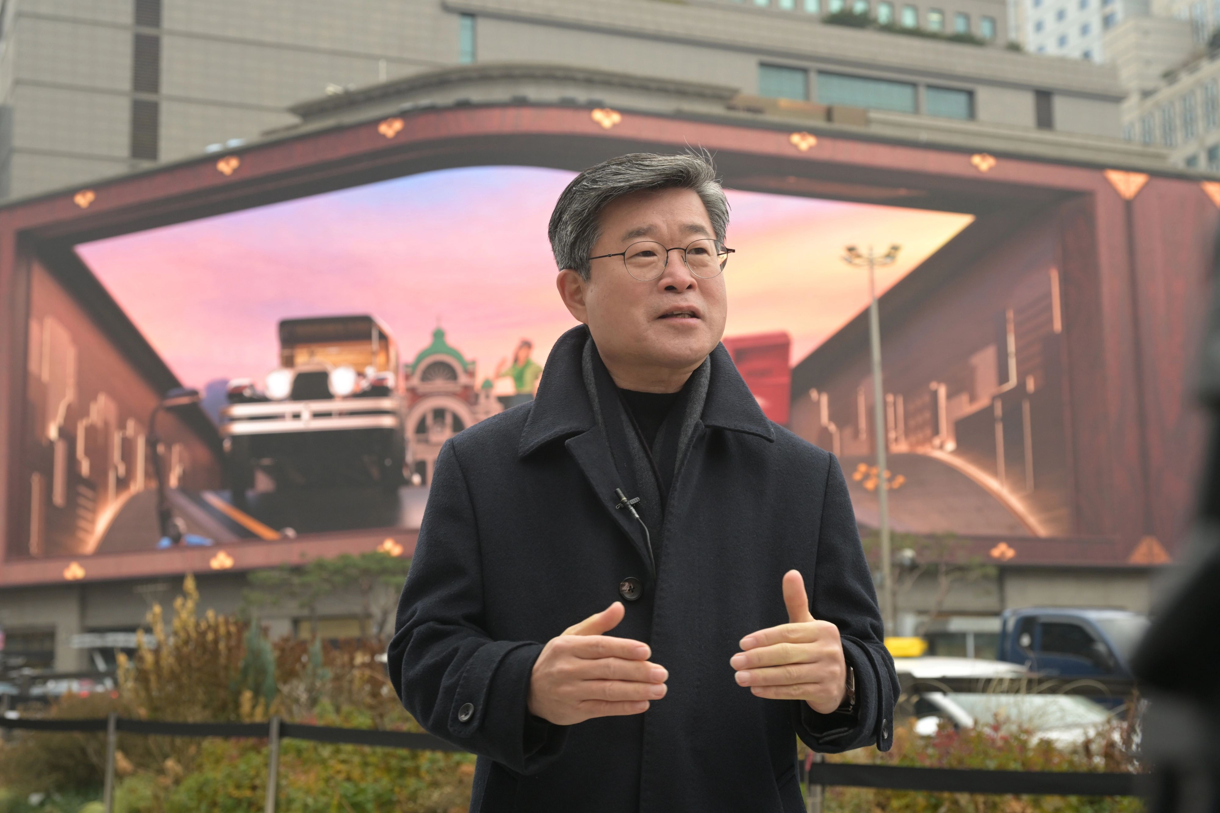 김길성 서울 중구청장이 21일 ‘2026년 새해맞이 카운트다운 쇼’를 통해 전 세계에 존재감을 각인시킨 ‘명동스퀘어’에서 구정 철학을 설명하고 있다. 김 구청장은 “그동안의 결실을 토대로 앞으로 10년을 내다보는 비전을 제시하고 싶다. 중구가 어떤 도시여야 하는지, 어떤 방향으로 나아가야 하는지 구체적인 청사진을 그려야 할 때”라고 강조했다.
