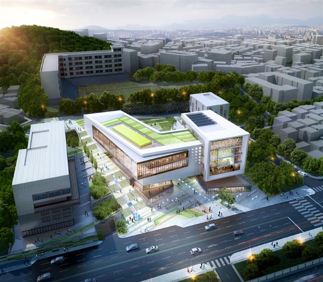 마포구 성산동 옛 구청사 부지에 들어설 마포중앙도서관 및 청소년교육센터(조감도)가 성서중학교, 성미산공원, 인근 마을로 새 길을 연결해 조성된다. 주변환경과 도시환경의 조화에 초점을 맞췄다.