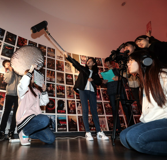 영화는 어떻게 만드는 걸까  27일 오후 서울 마포구 상암동 한국영상자료원에서 열린 자유학기제 체험 프로그램 ‘영화를 만든 사람들’에 참가한 학생들이 영화 제작 과정을 체험하고 있다.<br>연합뉴스