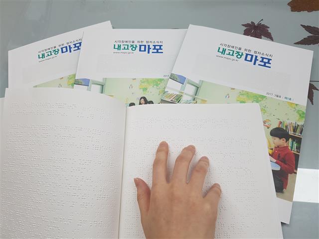 마포구는 올해부터 분기마다 구정 정보가 담긴 소식지 ‘내고장 마포’를 점자 형태로 100부씩 발행해 받아보길 원하는 장애인의 가정에 보내주기로 했다고 6일 밝혔다. 첫 호는 지난달 27일 발행됐으며 다음 호는 오는 5월 25일 나온다. 이인숙 구 공보담당관은 “그동안 스마트폰 등을 통해 구정 소식을 음성으로 들려주는 서비스는 해 왔지만, 기기를 다루는 데 익숙지 않은 시각장애인을 위한 서비스가 없었다”면서 “구민이라면 누구나 구정 정보를 쉽게 구할 수 있도록 하기 위해 점자 소식지를 만든 것”이라고 말했다. 구에는 현재 시각장애인 1566명이 살고 있고 이 가운데 1급 시각장애인(좋은 눈의 시력이 0.02 이하)은 242명이다.