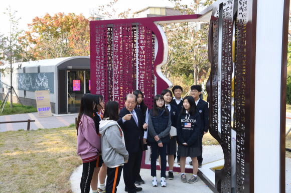 박홍섭(왼쪽 세 번째) 서울 마포구청장이 지난 27일 서울 마포구 와우산로 35길 경의선 책거리가 조성된 지 1주년을 기념해 제작된 조형물 앞에서 학생들과 이야기를 나누고 있다.