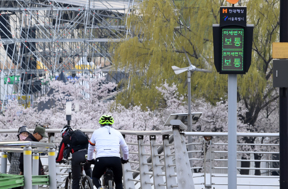 11일 오후 서울 마포 난지하늘다리에 설치된 미세먼지 신호등이 보통을 나타내고 있다. 서울시와 현대해상이 업무협약을 맺고 한강시민공원 주요 진입로 11곳에 설치했다.