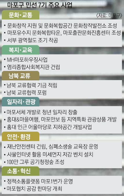 “마포구는 긴급 주거위기 상황에 처한 저소득 주거위기 가구를 돕기 위해 올 들어 MH마포하우징을 운영하고 있다. 민선 7기 선거 공약으로 내놨고 올 들어 7월 현재 MH마포하우징 4호가 지정되는 등 사업이 궤도에 올랐다. 연내 마포하우징용 주택 10채를 매입한다. 김현미 국토부 장관이 기초자치단체가 그동안 생각지도 않았던 주거복지 분야에 발벗고 뛰어들었다는 점에서 지원 의사를 밝혔고, 김세용 SH공사 사장도 임대주택 6채를 MH마포하우징용으로 제공하겠다고 했다. 선거 공약으로 제안할 당시 담당자들이 복지는 인기가 없다고 말렸는데 적극 추진한 결과가 좋아 보람이 크다.”