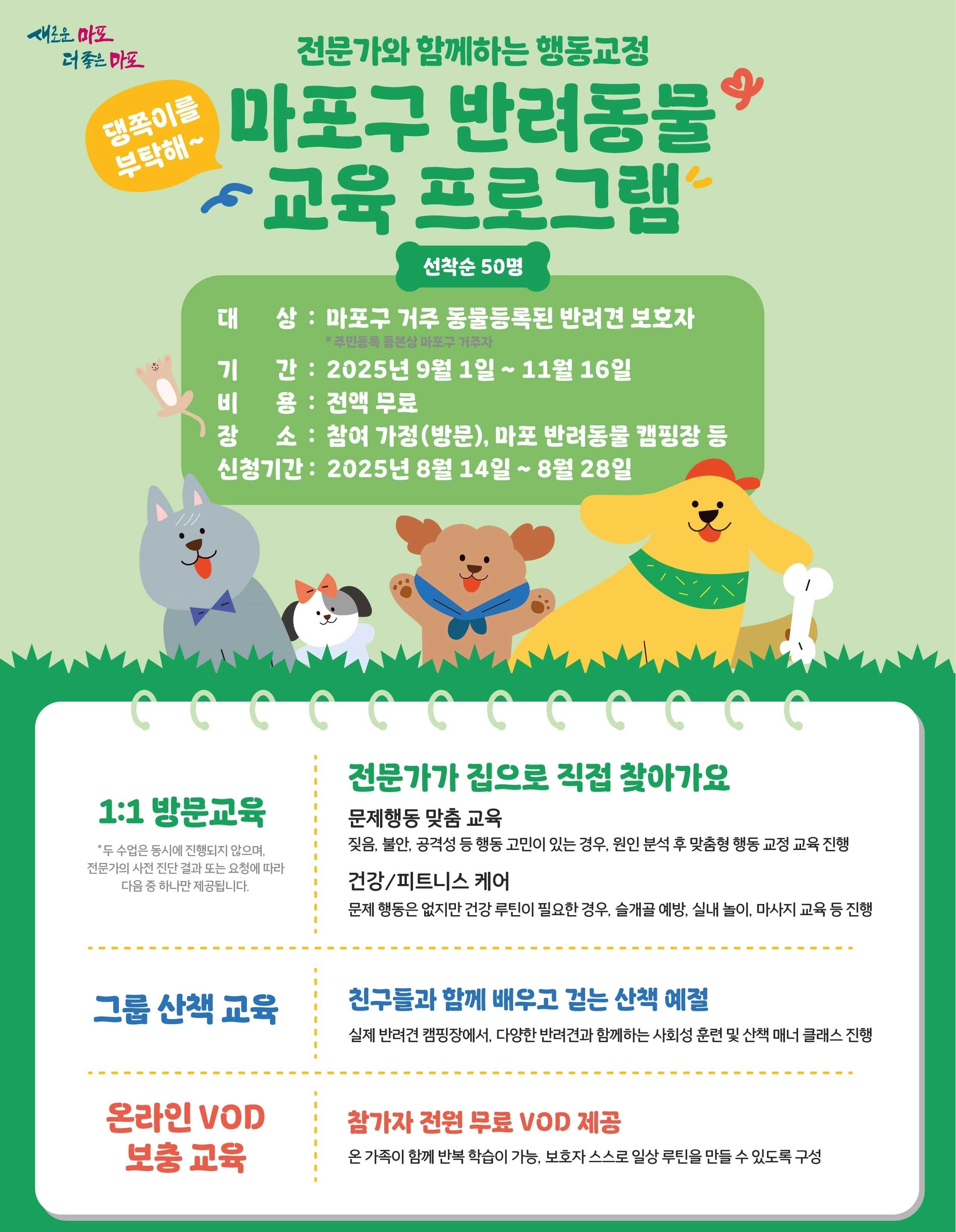 서울 마포구는 ‘2025년 반려동물 교육 프로그램’을 다음달 1일부터 11월 16일까지 운영한다고 13일 밝혔다.