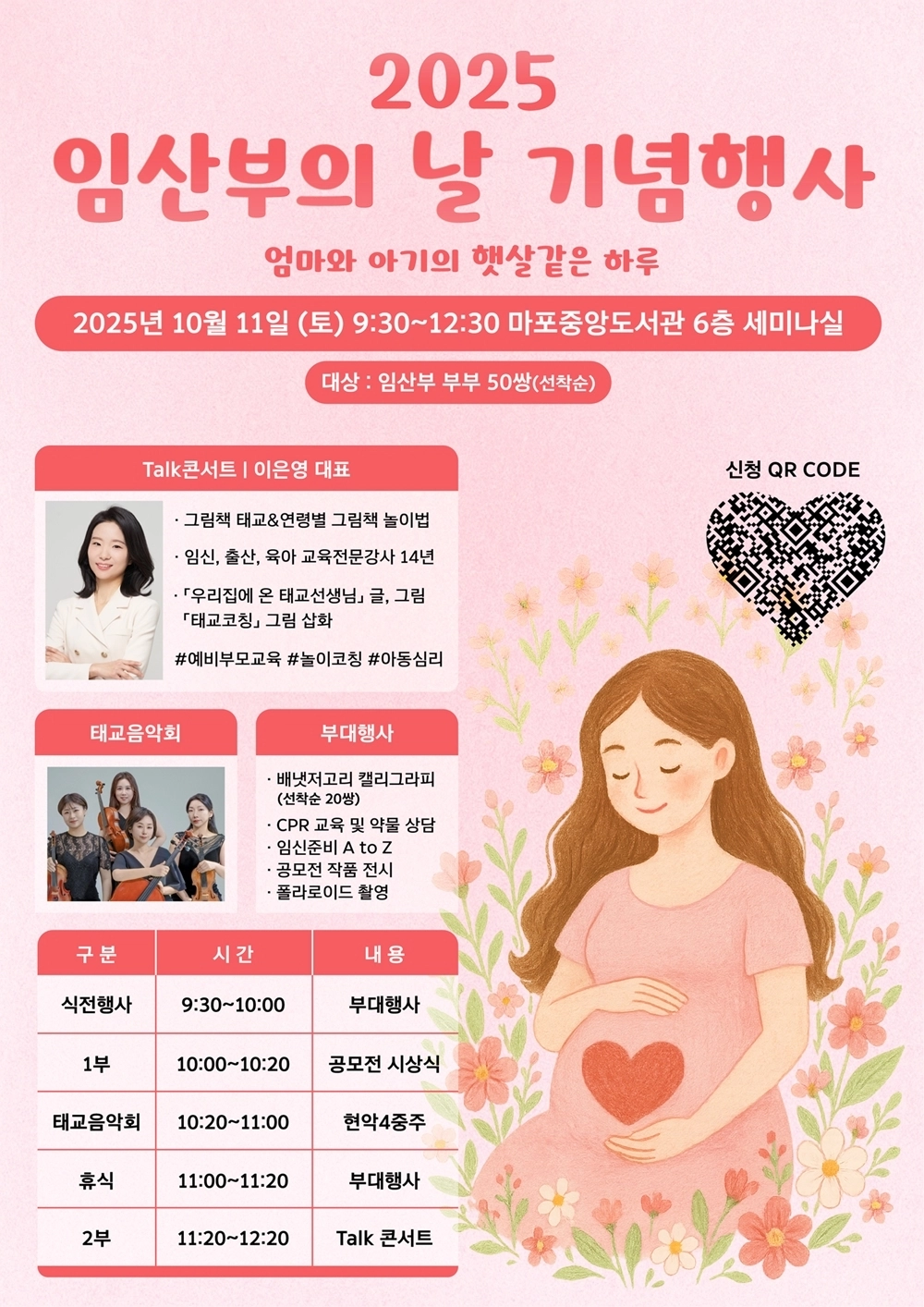 이번 행사는 현악 4중주의 선율을 담은 ‘태교 음악회’와 함께 예비 부모를 위한 ‘감성태교 토크 콘서트’를 비롯해 풍성한 프로그램으로 진행된다. 토크 콘서트에선 임신·출산·육아 교육전문기업 비커밍맘스쿨 이은영 대표가 그림책을 활용한 태교법과 아이의 연령별 책 읽기 놀이법을 소개한다. 이 외에도 ▲출산장려 슬로건 및 사진 공모전 시상식 ▲캘리그래피를 활용한 태명 배냇저고리 만들기 ▲영유아 심폐소생술(CPR) 체험 ▲임산부 약물 상담 등 다채로운 부대행사가 마련돼 예비 부모들에게 유익한 시간을 제공한다.