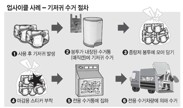 유한킴벌리는 고급 펄프를 이용해 일회용 기저귀를 만들지만 재활용되지 못하고 버려지는 기저귀 재활용 방안을 연구 중이다. 연간 국내에서 발생하는 24만여t의 기저귀는 전량 소각(55%) 및 매립(45%)되고 있다. 이번 시범사업은 본격적인 연구에 앞서 기저귀 재활용 기술과 분리 배출 및 수거 시스템을 연구하는 단계다. 구는 기저귀 재활용 성공 땐 환경오염 감소와 더불어 장기적으로 자원재활용의 새로운 전기가 마련될 것으로 내다봤다.