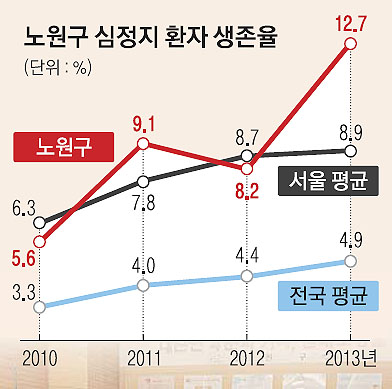질병관리본부의 ‘심정지 환자 생존율 현황’을 분석해 이날 발표한 노원구 자료에 따르면 2010년 5.6%였던 심정지 환자 생존율이 지난해 12.7%로 2.3배나 뛰어올랐다. 특히 2010년 심정지 환자 수는 248명으로 서울시 25개 자치구 가운데 가장 높았다.
