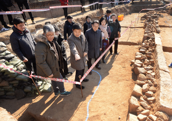 11일 김영배(앞줄 왼쪽 두 번째) 서울 성북구청장을 비롯한 참석자들이 조선시대 국가 제례시설인 선잠단 유적 발굴 현장을 둘러보고 있다.