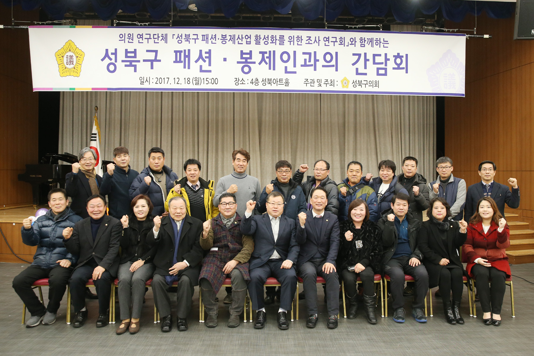 성북구의회, 구 패션·봉제인과의 간담회  지난 18일 서울 성북구청에서 성북구의회 의원들이 구에서 일하고 있는 패션·봉제인과의 간담회를 진행했다. 이 자리에는 김태수 (앞줄 오른쪽 다섯 번째) 성북구의회 의장 직무대행을 비롯해 (왼쪽에서) 김일영(두 번째),진선아(세 번째) 의원, 노양호 서울패션섬유봉제협회 회장(여섯 번째), (오른쪽에서) 이은영(첫 번째), 안향자(두 번째) 의원, 안선희(네 번째) 동덕여대 평생교육원 교수가 참석했다.<br>성북구의회 제공<br>