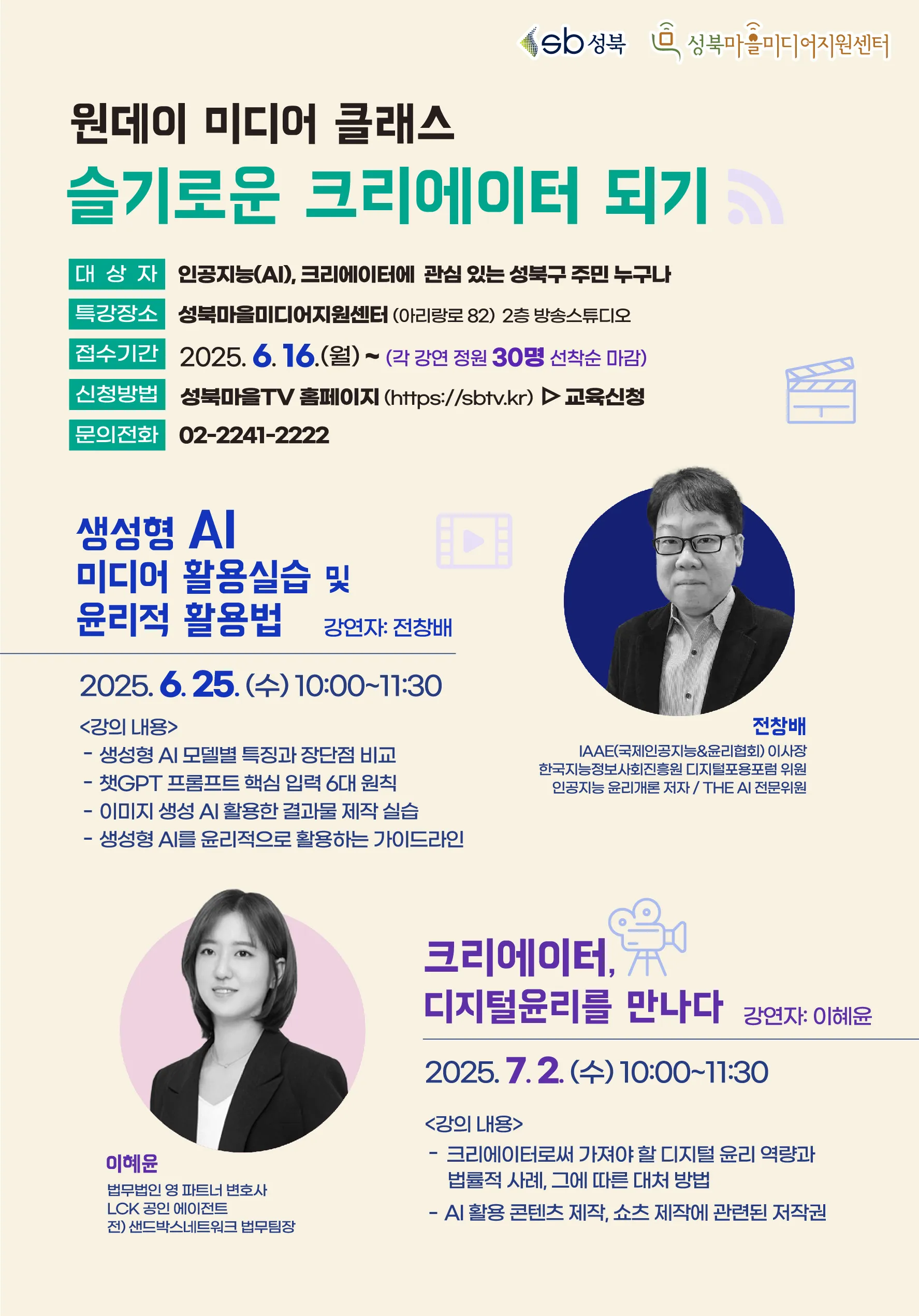 돈암동에 있는 성북마을미디어지원센터에서 열리는 이번 특강은 빠르게 변하는 디지털 시대에 발맞춰 주민들의 콘텐츠 제작 역량 등을 강화하고자 마련됐다.