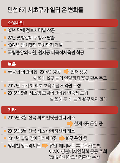 현재의 구청사를 갖게 된 사연도 마찬가지다. 1만 3200㎡(약 4000평) 상당의 서울시 소유 구청사를 서초구 공원토지 3300㎡(약 1000평)와 맞교환함으로써 27년간의 셋방살이에서 탈출했다. 40여 년간 고물상 등 쓰레기 더미에 묻혀 있던 방배동 국회단지, 제2의 구룡마을인 성뒤마을 역시 현장 관계자들을 직접 만나며 각각 전원주택 단지·공영 개발키로 했다.