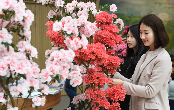 봄꽃이 활짝 피었다. 개구리가 겨울잠에서 깨어난다는 ‘경칩’(3월 6일)을 일주일 앞둔 27일 서울 서초구청 로비에서 열린 봄꽃 직거래 장터를 찾은 시민이 꽃을 살펴보며 미소를 짓고 있다.
