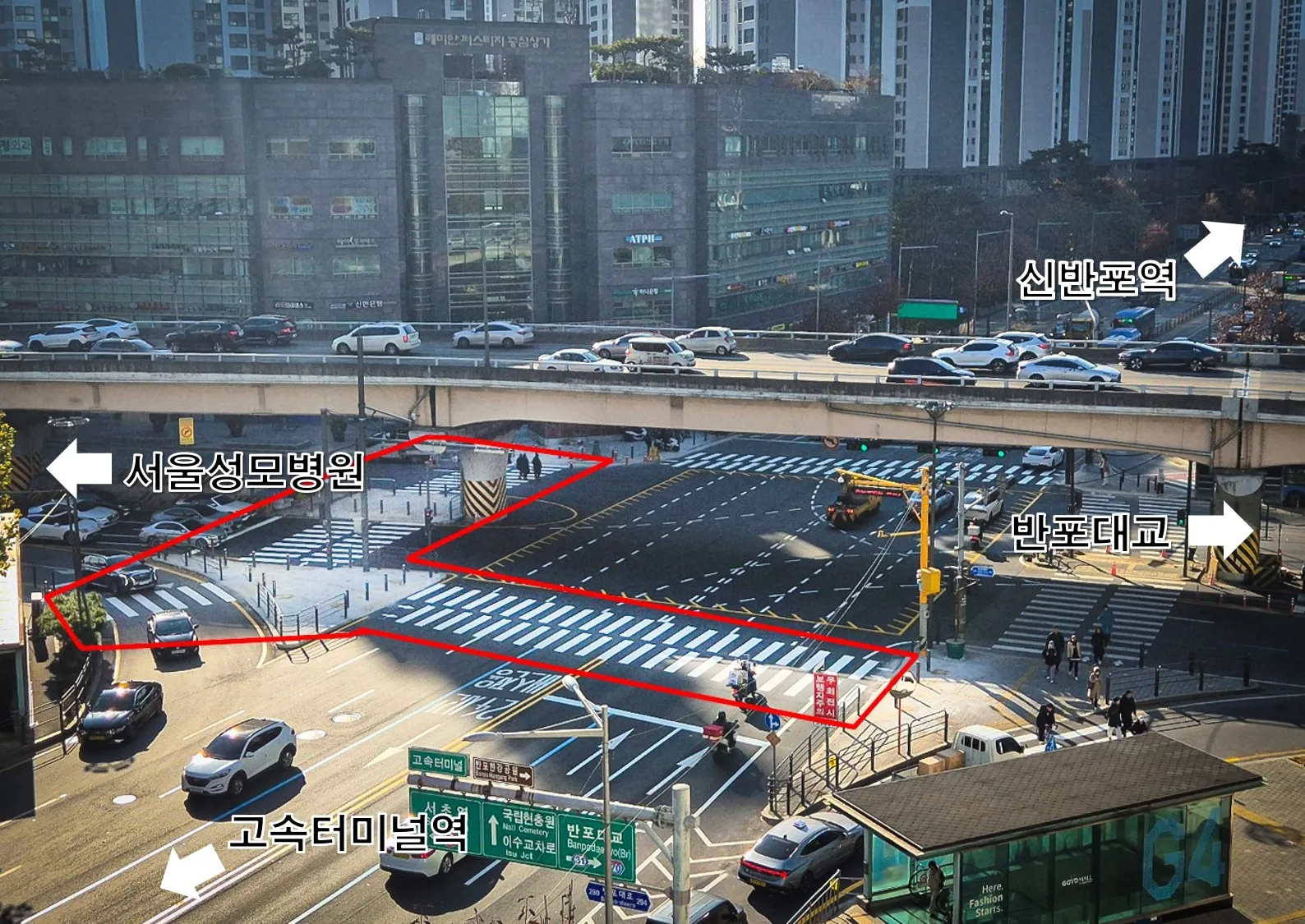 더불어 횡단보도와 함께 만들어진 교통섬에는 보행자를 보호하기 위해 전국 최초로 ‘서초형 인공지능(AI) 횡단보도’를 설치, 고속터미널 대형버스와 우회전 차량이 많은 반포동사거리에서 보행자에게 대형 차량의 접근을 사전에 알리도록 했다.