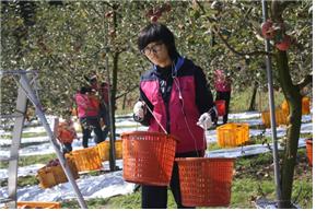 지난해 10월 경북 안동시 녹전면의 한 사과농장에서 성동구 건강가정지원센터 따뜻한 수레 가족봉사단원들이 바구니로 수확한 사과를 나르고 있다.