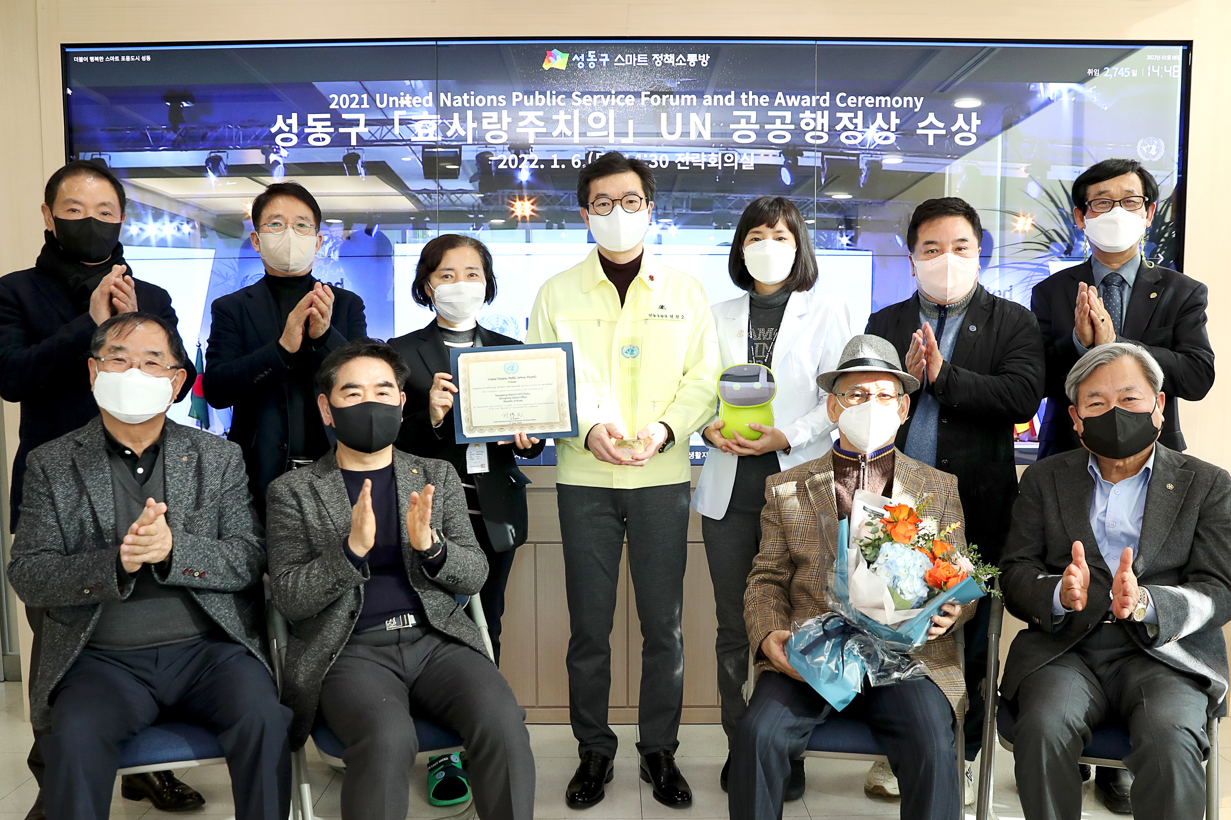 UN 공공행정상 시상식은 코로나19 확산으로 미뤄지다가 지난해 12월에야 아랍에미리트(UAE) 두바이에서 개최됐다. 그러나 정원오 성동구청장은 코로나19 변이 바이러스 오미크론 확산 등을 고려해 시상식에 참석하지 않고, 두바이 총영사관이 대리 수상했다. 이어 이날 외교부로부터 상장과 트로피를 전달 받았다.