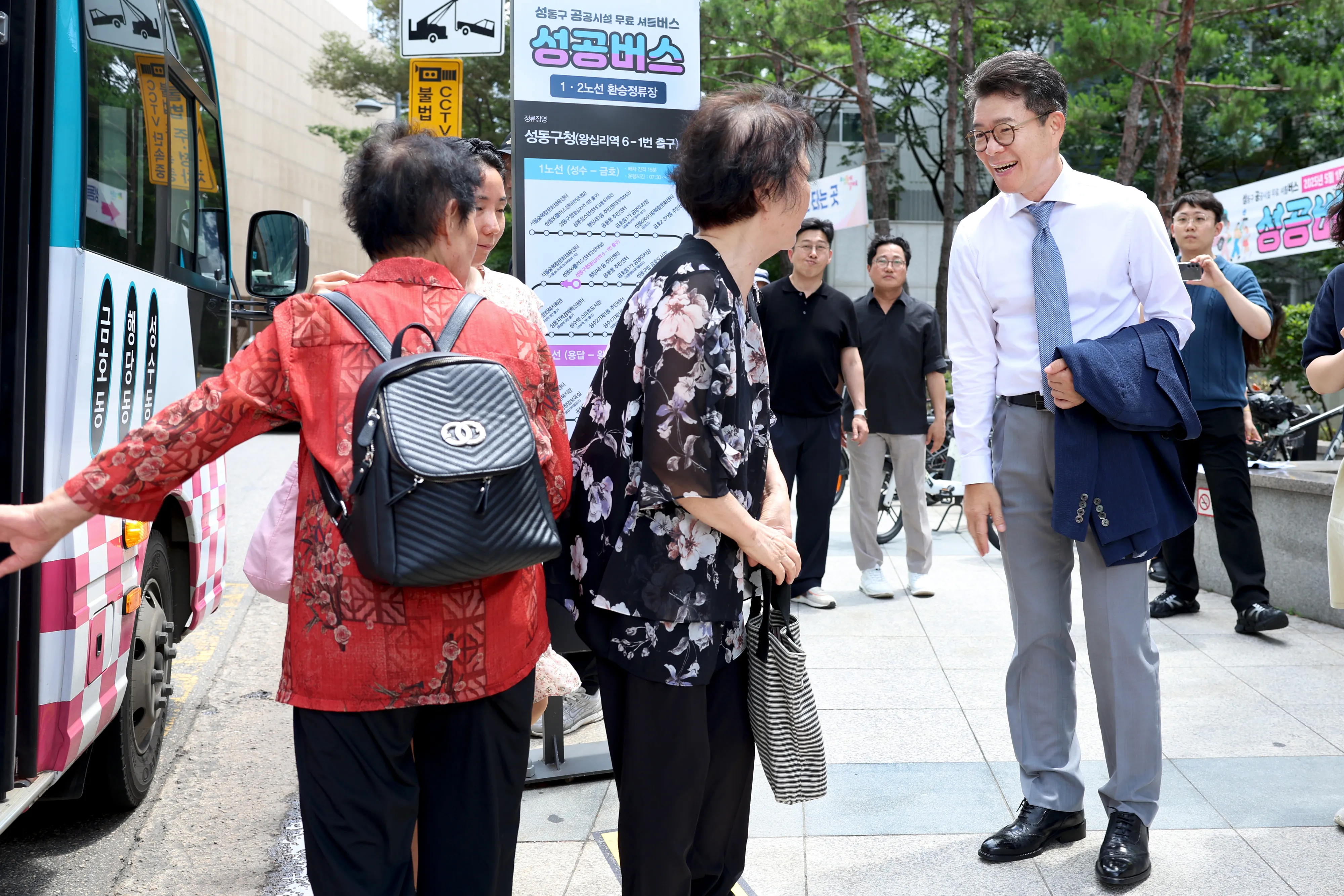 이날 정류장에서 만난 이현정(48)씨는 “왕십리에서 문화체육센터로 바로 가는 버스가 없어 불편했는데 성공버스 덕에 더운 날씨에도 편하게 다니고 있다”며 “노선 변경 민원도 금방 반영해 준 것으로 기억한다”고 말했다. 그러자 정 구청장은 “마을버스나 시내버스 노선을 만들려다 보니 필요한 시간을 딱 맞추기 어려워 실수요자들을 위해 새로이 마련한 것”이라며 “옥수동 노선 확장 등 편의성을 더 개선하고자 한다”고 감사를 표했다.