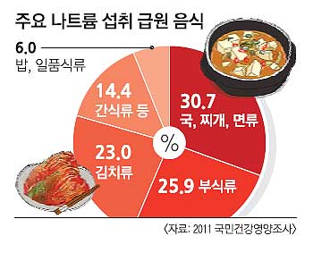 그러나 우리나라 성인 1인의 하루 나트륨 섭취량은 2013년 기준 4027㎎으로 2배 이상 높다. 나트륨 함량이 높은 국이나 찌개, 면류 섭취가 잦기 때문이다. 우리나라 사람들이 즐겨 먹는 육개장에는 2900㎎, 자장면에는 2400㎎의 나트륨이 들어 있다.
