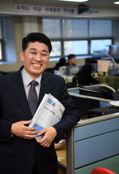 지난 30여년의 공직생활 동안 서울신문과 애환을 함께했던 고재용 서대문구 홍보담당관이 27일 오후 구청 대강당에서 진행되는 공로연수식을 앞두고 그동안 깊은 정이 든 서울신문을 들고 활짝 웃고 있다.