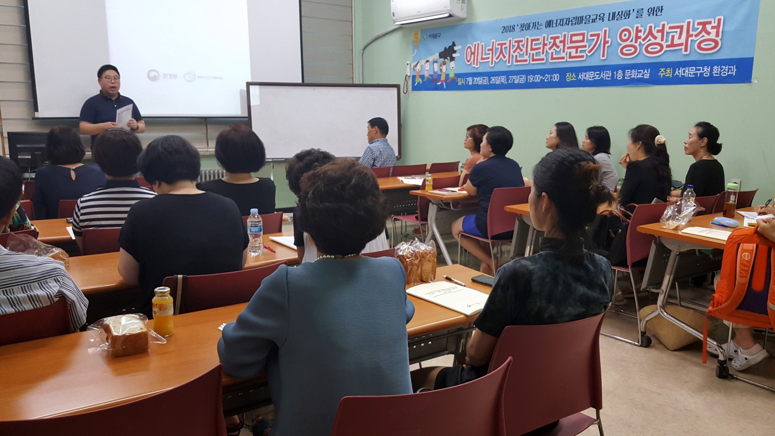 에너지진단 전문가 양성과정  지난달 서울 서대문도서관 문화교실에서 진행된 ‘에너지진단전문가 양성과정’에 참여한 주민들의 모습. 이들은 2~3명씩 조를 이뤄 주민들에게 에너지 절감 방안을 안내한다.<br><br>서대문구 제공<br>