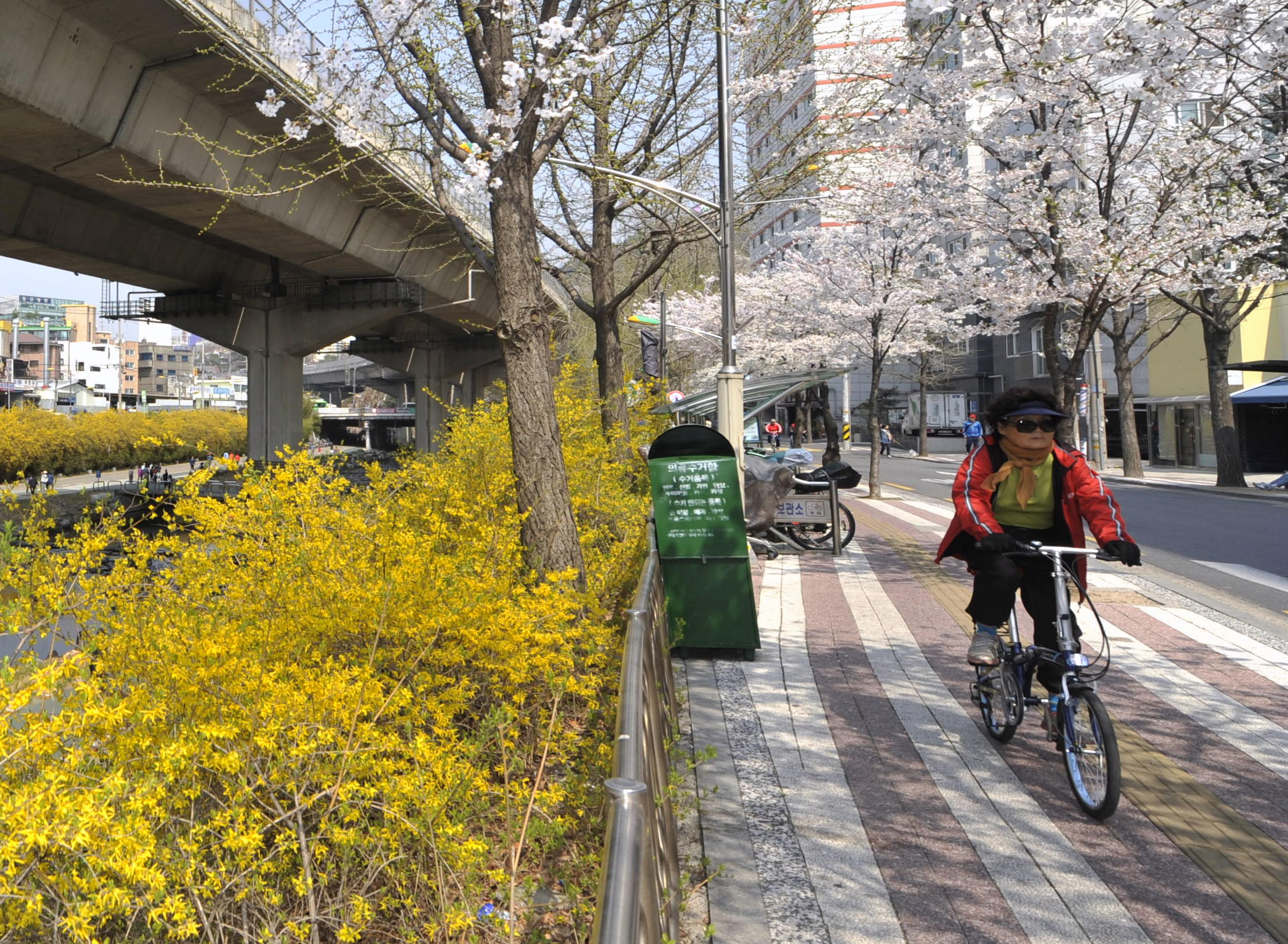 봄꽃이 핀 서대문구의 한 거리를 한 여성이 자전거를 타고 지나고 있다.